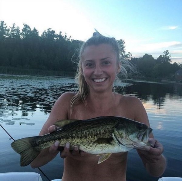 Fish-bra selfie. That’s a b-cup bass at best. I refuse to look at fish-bra selfies unless the fisherwoman is struggling under the weight of a bluefin tuna. To be realistic, you’d also have to divide them between freshwater fish-bra and saltwater.