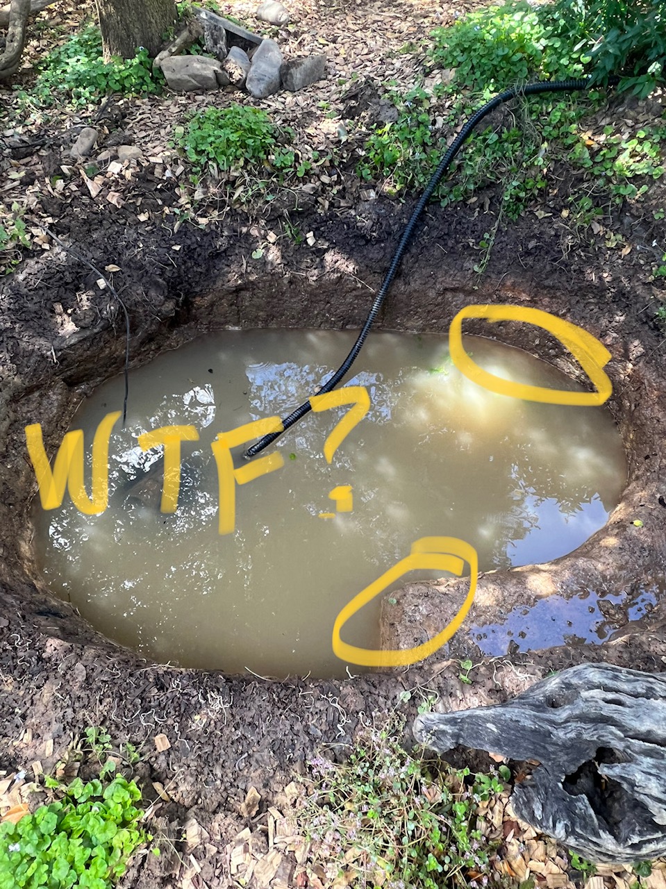I cleaned and dried the old liner and inspected it for the suspect gash. No gash! I’d tested the filter and waterfall before I drained the pond, and they had seemed okay? A mystery! Even more mysterious were the Native Violets growing in the pit — ie no air or light??