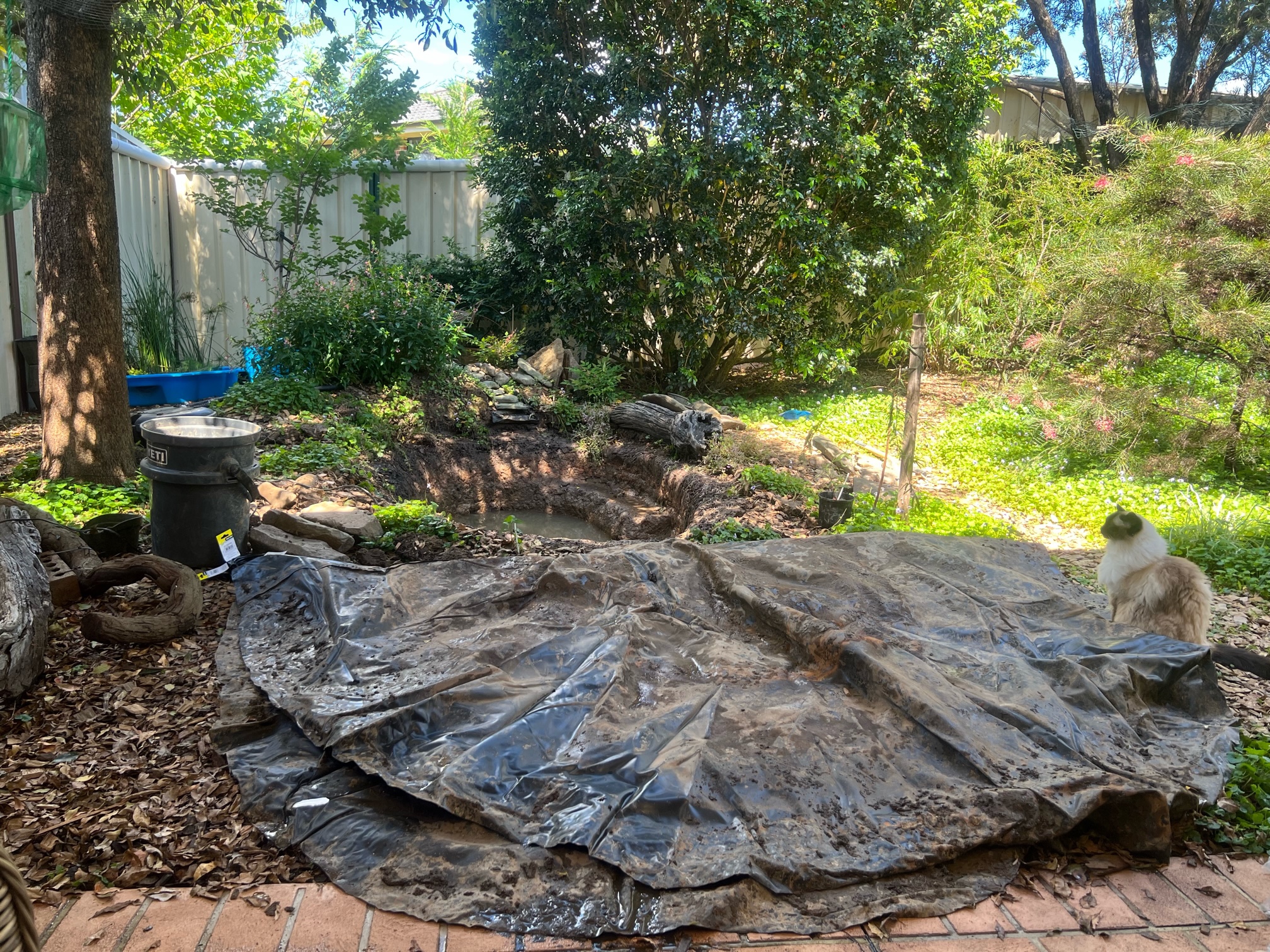 I pulled the old liner out and bailed as much water as I could. However, each morning, no matter how ’empty’ it was the night before, 10cm of water. Aha! It was seeping back into the pit from the surrounding yard!